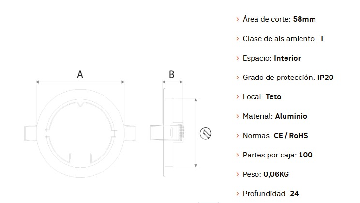 Este aro redondo fijo de aluminio es ideal para instalaciones empotradas en techos falsos. Con 78 mm de diámetro y 24 mm de profundidad, proporciona una solución discreta y eficaz para iluminación interior. Compatible con bombillas GU10 (no incluidas) y soporte (no incluido). Protección IP20 y clase de aislamiento I – para interiores secos.